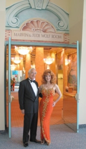 In 1992 the Judi and Marvin donated the reception salon for the community at the then new Buell Theatre, which was named the “Marvin and Judi Wolf Room.” The lavishly decorated Wolf Room is fashioned in the mediterranean style of her favorite home and retreat in La Jolla, California. If you look carefully at the expansive mural on the wall you will find a red wolf frolicking in the landscape.