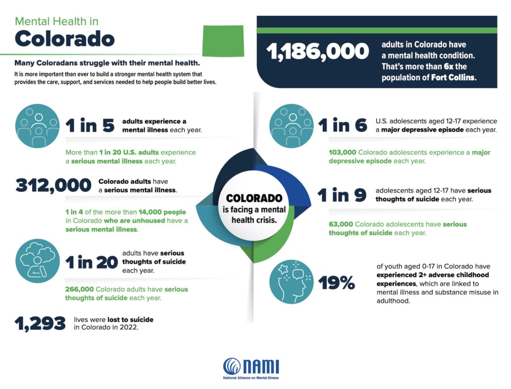 In March 2025, the National Alliance on Mental Illness in Colorado reported that 1,186,000 adults in Colorado have a mental health condition. The Colorado stats are sobering: