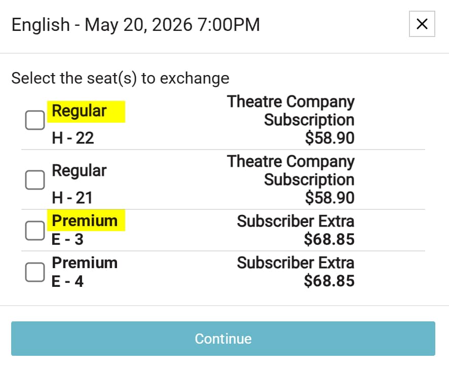 If you purchased tickets with different ticket types (for example “Broadway Subscriber” tickets are a different ticket type than “Subscriber Extra” tickets), they will need to be exchanged separately.